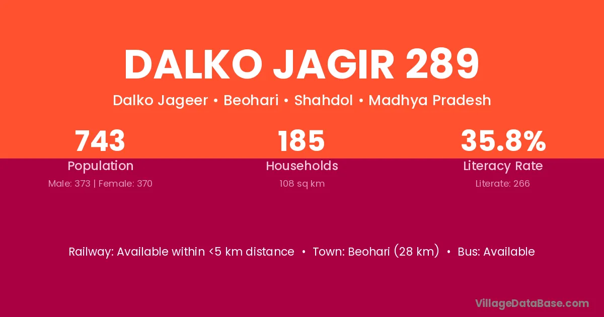 Beohari (28 km) is the nearest town to Dalko Jagir 289 village for major economic activities and is located approximately 28 km away.