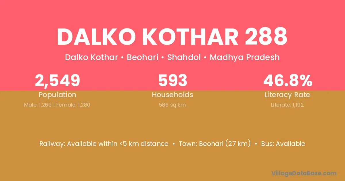 Beohari (27 km) is the nearest town to Dalko Kothar 288 village for major economic activities and is located approximately 27 km away.