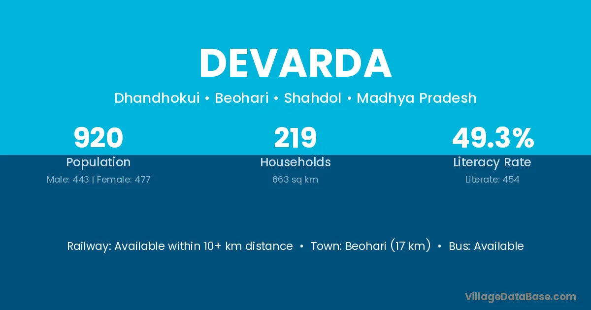 Beohari (17 km) is the nearest town to Devarda village for major economic activities and is located approximately 17 km away.