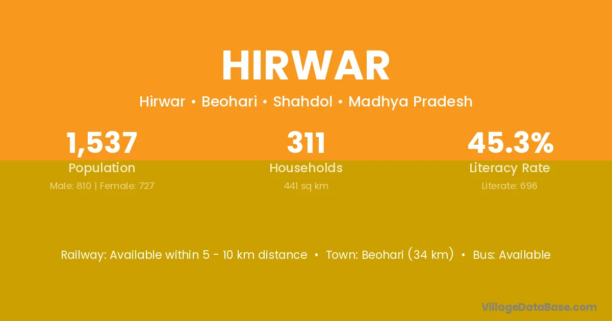 Beohari (34 km) is the nearest town to Hirwar village for major economic activities and is located approximately 34 km away.