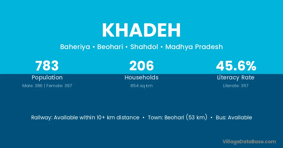 Beohari (53 km) is the nearest town to Khadeh village for major economic activities and is located approximately 53 km away.