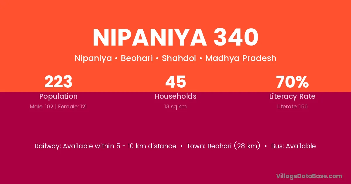 Nipaniya 340 village has a total population of 223 people, of which 102 are males and 121 are females.