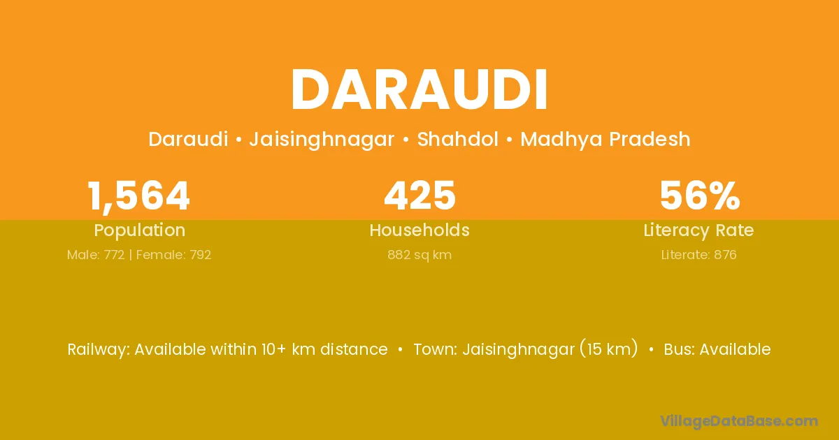 Jaisinghnagar (15 km) is the nearest town to Daraudi village for major economic activities and is located approximately 15 km away.