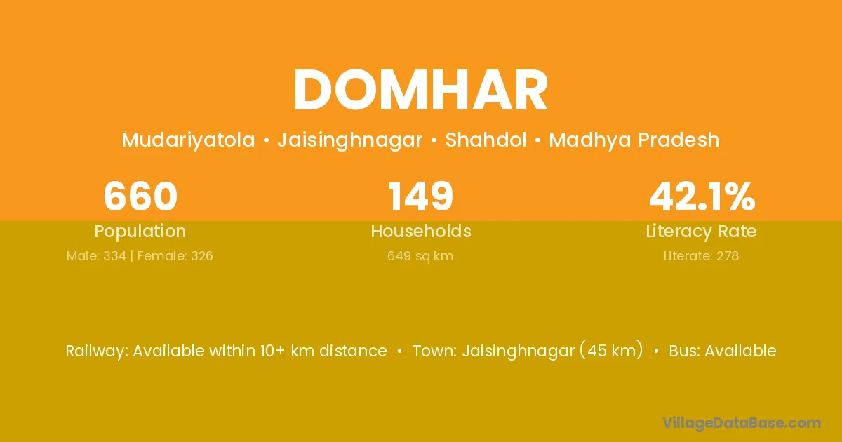Domhar village has a total population of 660 people, of which 334 are males and 326 are females.