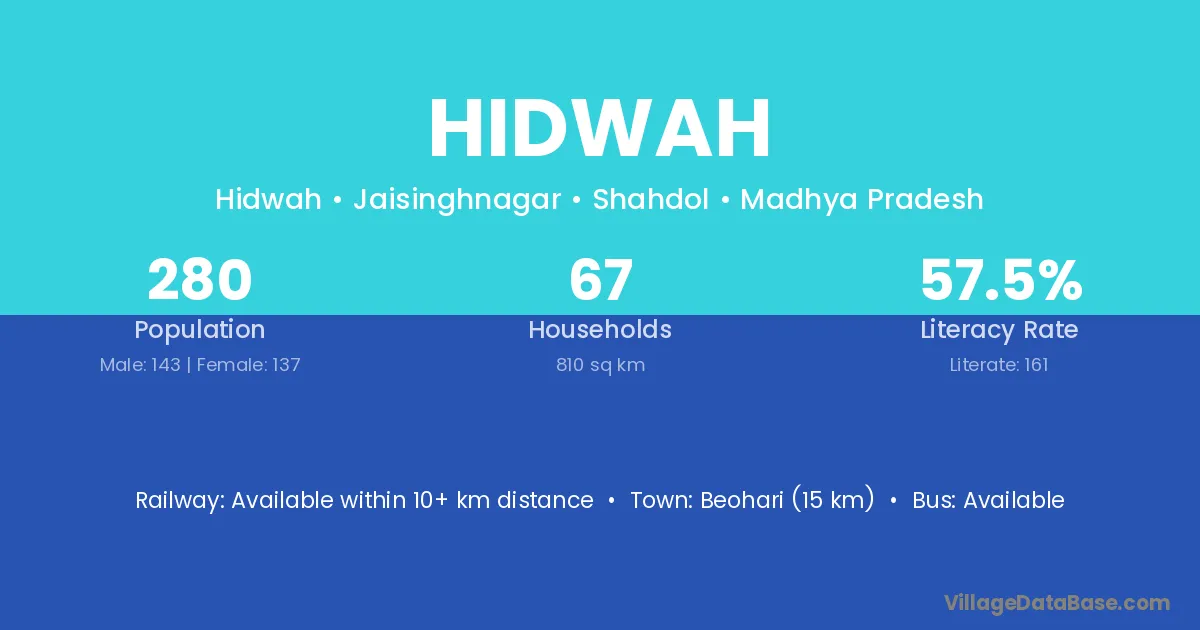 Beohari (15 km) is the nearest town to Hidwah village for major economic activities and is located approximately 15 km away.