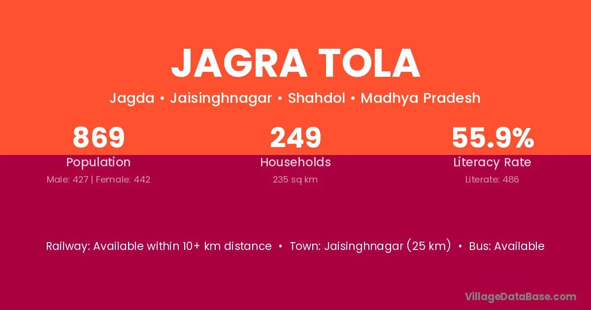 Jagra Tola village has a total population of 869 people, of which 427 are males and 442 are females.