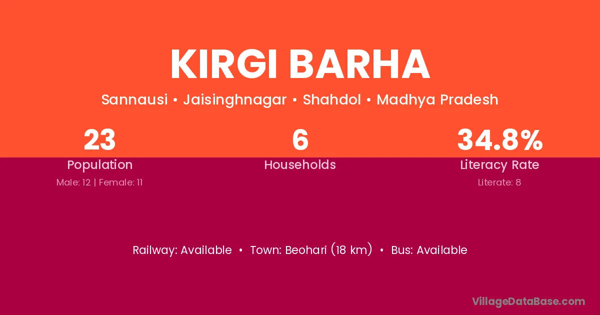 Beohari (18 km) is the nearest town to Kirgi Barha village for major economic activities and is located approximately 18 km away.