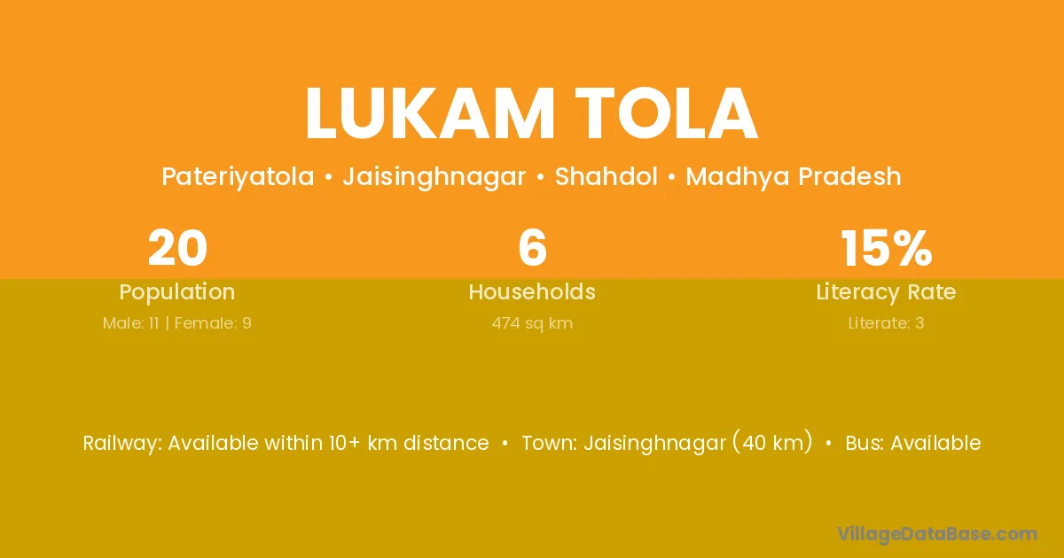 Lukam Tola village has a total population of 20 people, of which 11 are males and 9 are females.