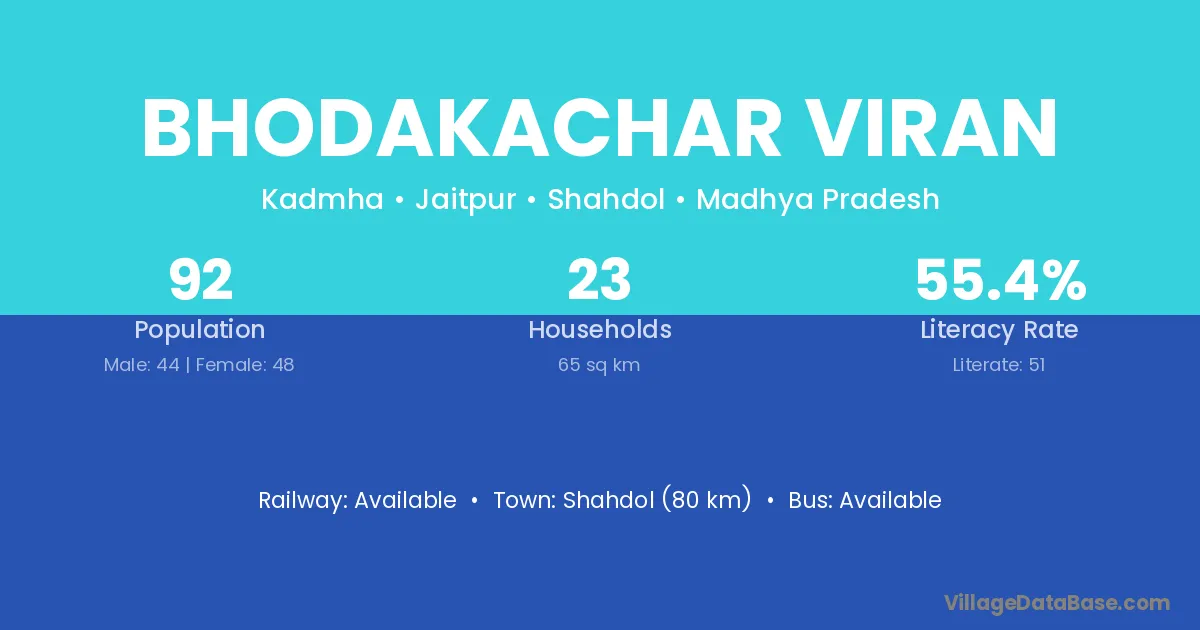 Shahdol (80 km) is the nearest town to Bhodakachar Viran village for major economic activities and is located approximately 80 km away.