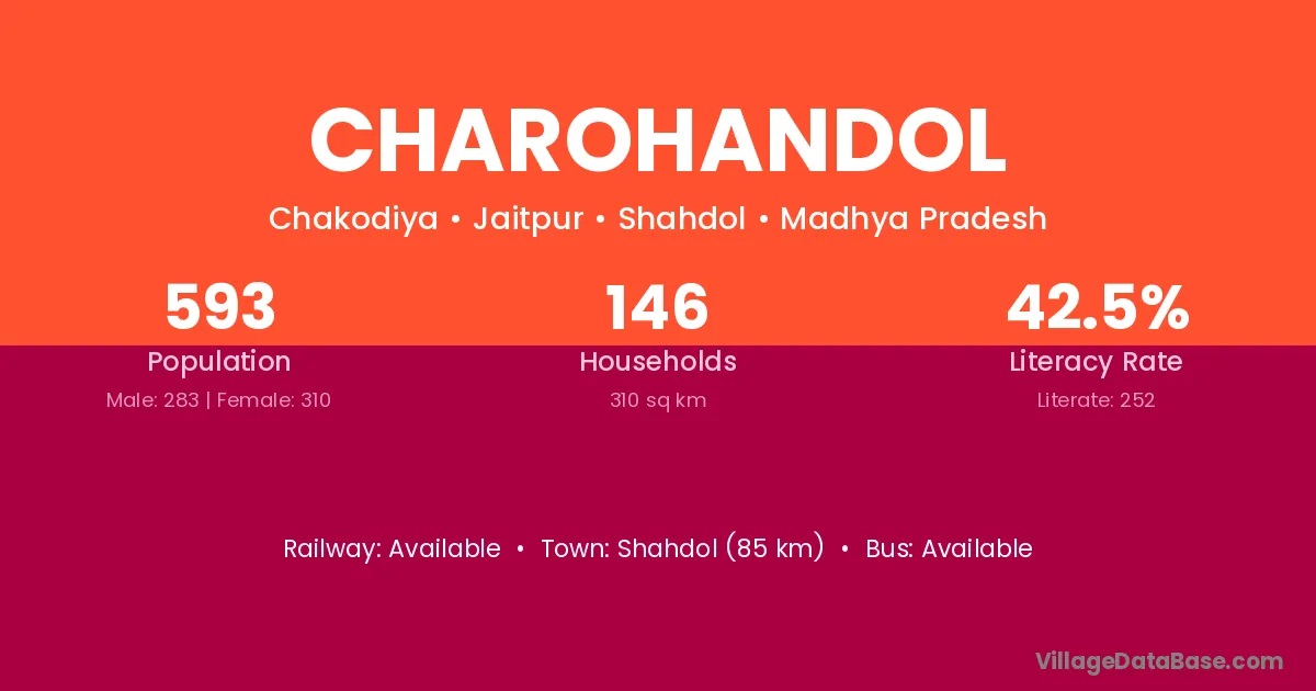 Shahdol (85 km) is the nearest town to Charohandol village for major economic activities and is located approximately 85 km away.