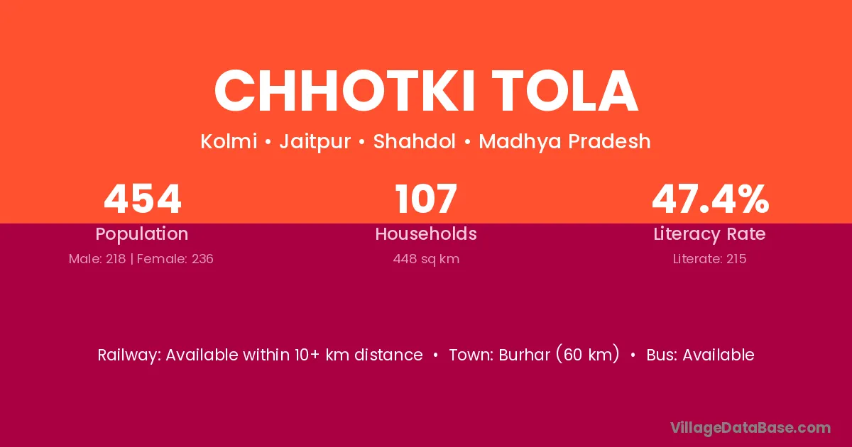 Chhotki Tola village has a total population of 454 people, of which 218 are males and 236 are females.