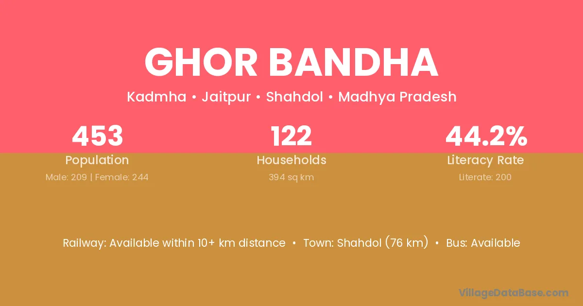 Shahdol (76 km) is the nearest town to Ghor Bandha village for major economic activities and is located approximately 76 km away.
