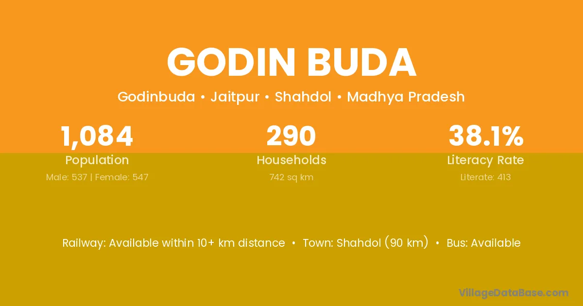 Shahdol (90 km) is the nearest town to Godin Buda village for major economic activities and is located approximately 90 km away.