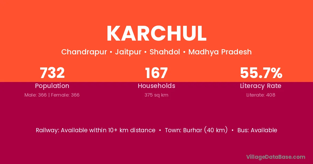 Burhar (40 km) is the nearest town to Karchul village for major economic activities and is located approximately 40 km away.