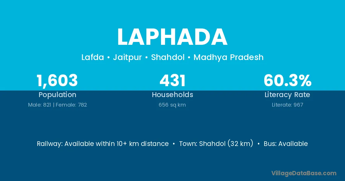 Shahdol (32 km) is the nearest town to Laphada village for major economic activities and is located approximately 32 km away.