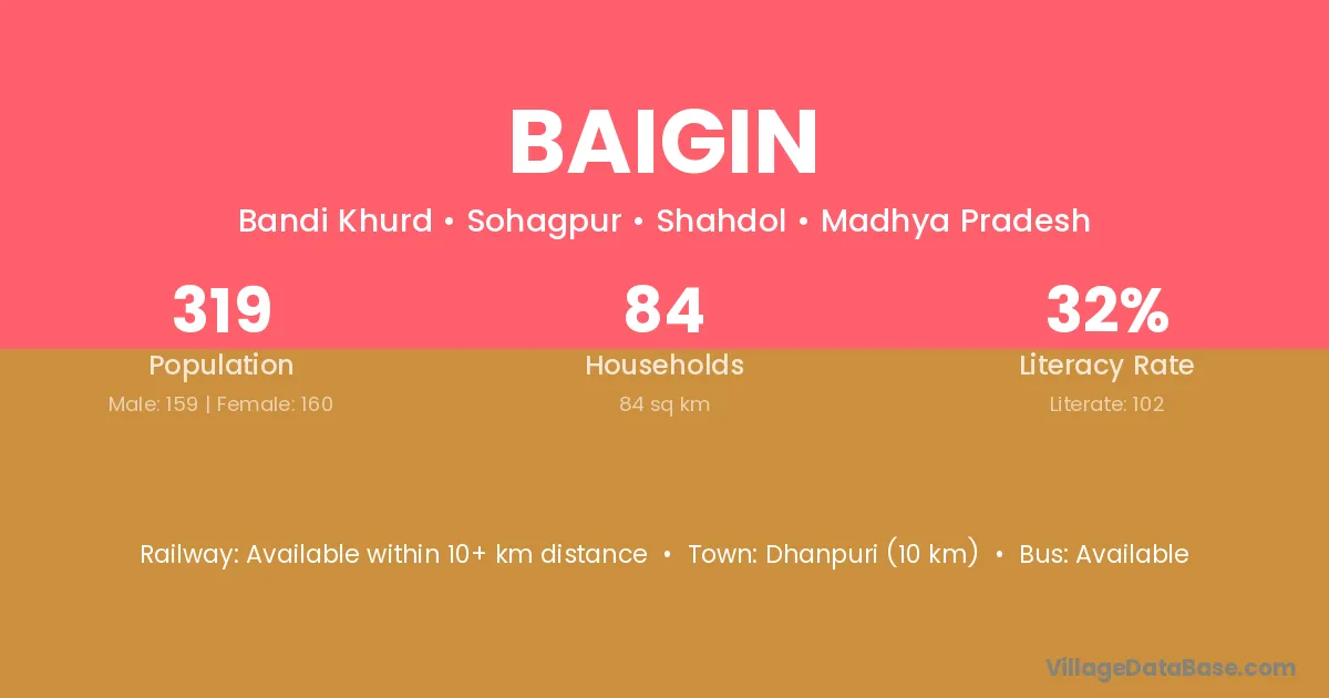 Dhanpuri (10 km) is the nearest town to Baigin village for major economic activities and is located approximately 10 km away.