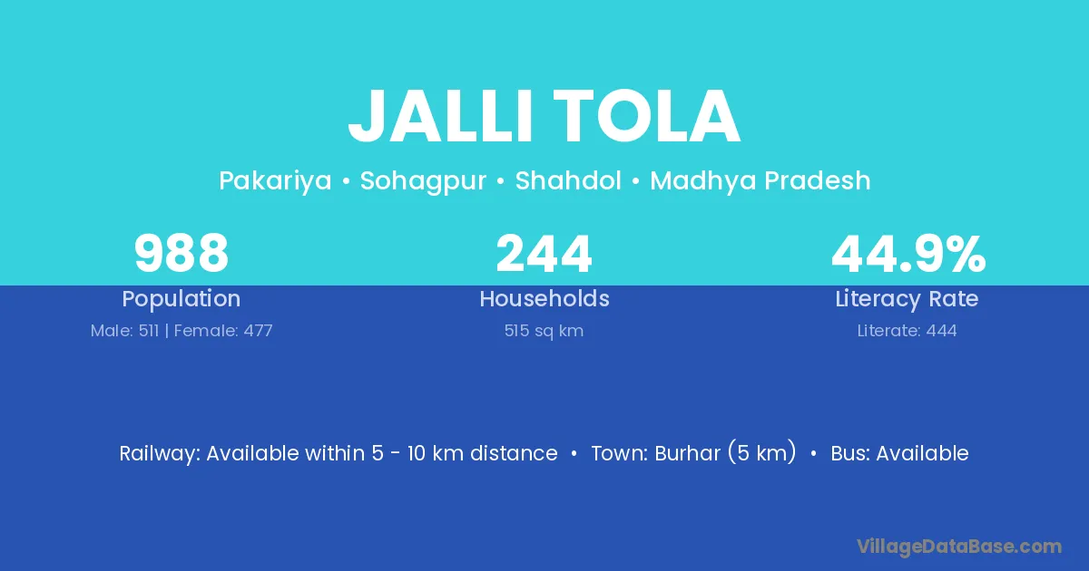 Jalli Tola village has a total population of 988 people, of which 511 are males and 477 are females.