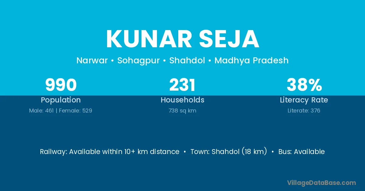 Shahdol (18 km) is the nearest town to Kunar Seja village for major economic activities and is located approximately 18 km away.
