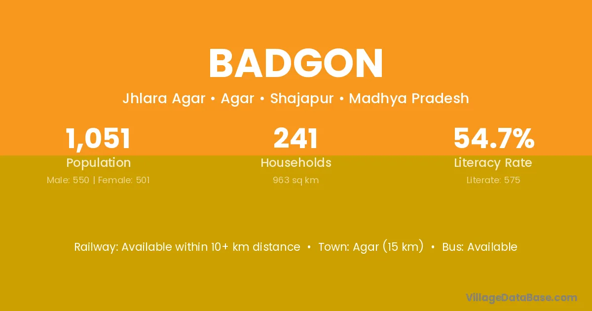 Agar (15 km) is the nearest town to Badgon village for major economic activities and is located approximately 15 km away.