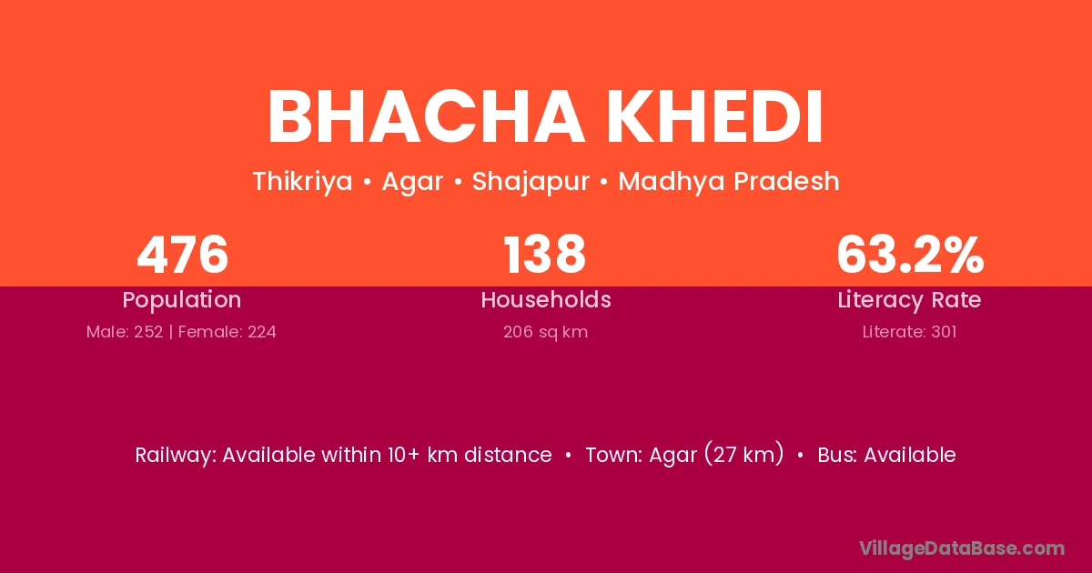 Agar (27 km) is the nearest town to Bhacha Khedi village for major economic activities and is located approximately 27 km away.