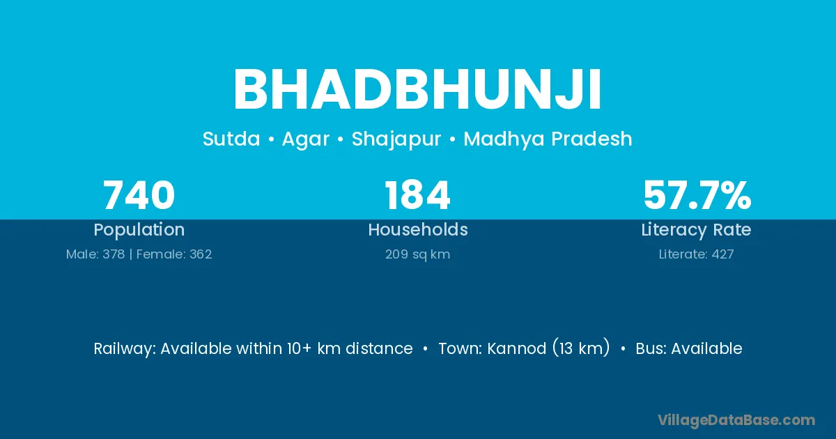 Kannod (13 km) is the nearest town to Bhadbhunji village for major economic activities and is located approximately 13 km away.
