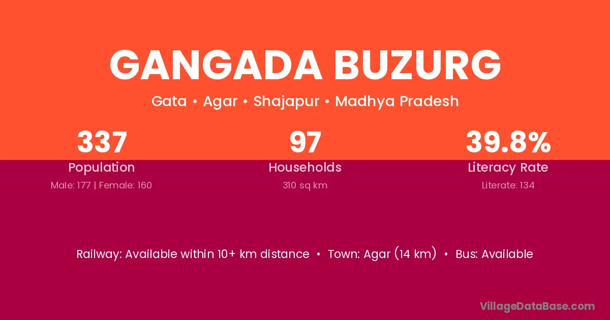 Agar (14 km) is the nearest town to Gangada Buzurg village for major economic activities and is located approximately 14 km away.