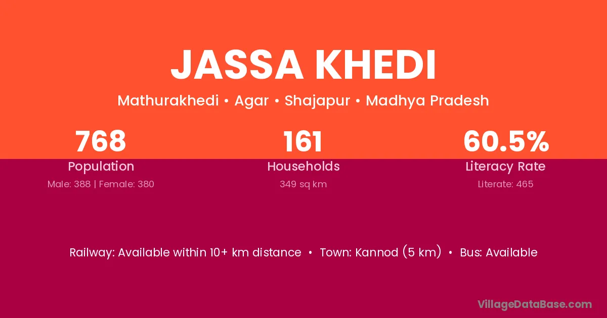 Jassa Khedi village has a total population of 768 people, of which 388 are males and 380 are females.