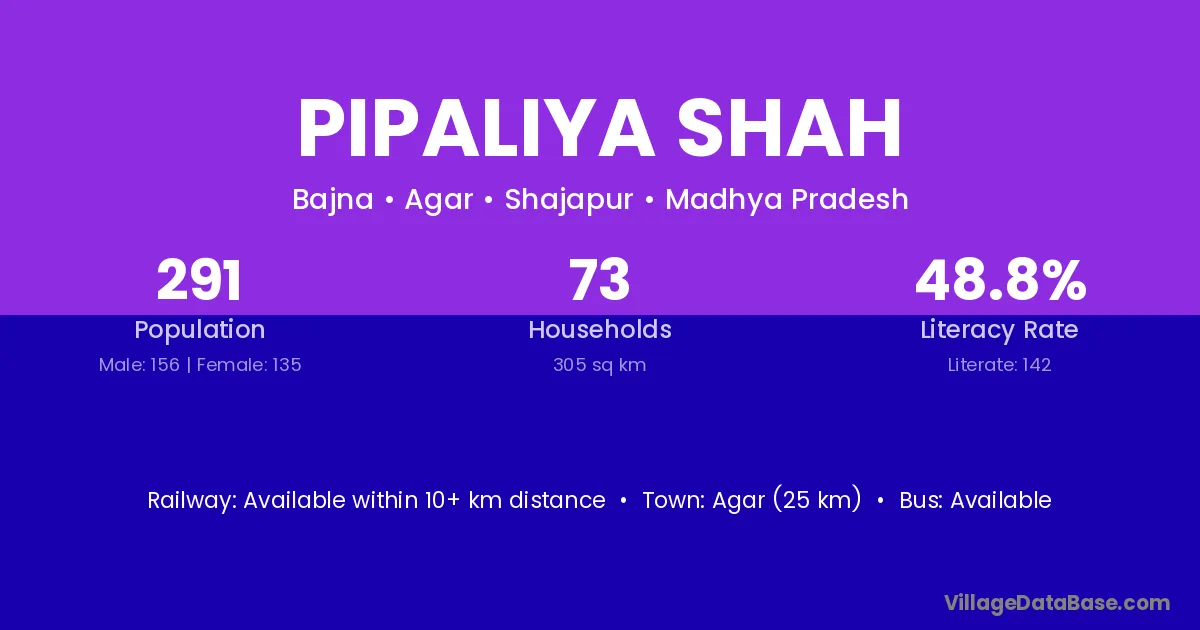 Agar (25 km) is the nearest town to Pipaliya Shah village for major economic activities and is located approximately 25 km away.