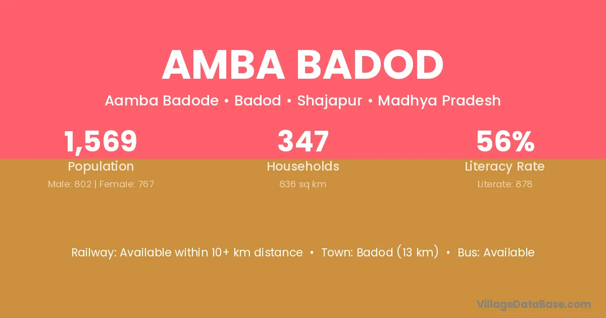 Badod (13 km) is the nearest town to Amba Badod village for major economic activities and is located approximately 13 km away.