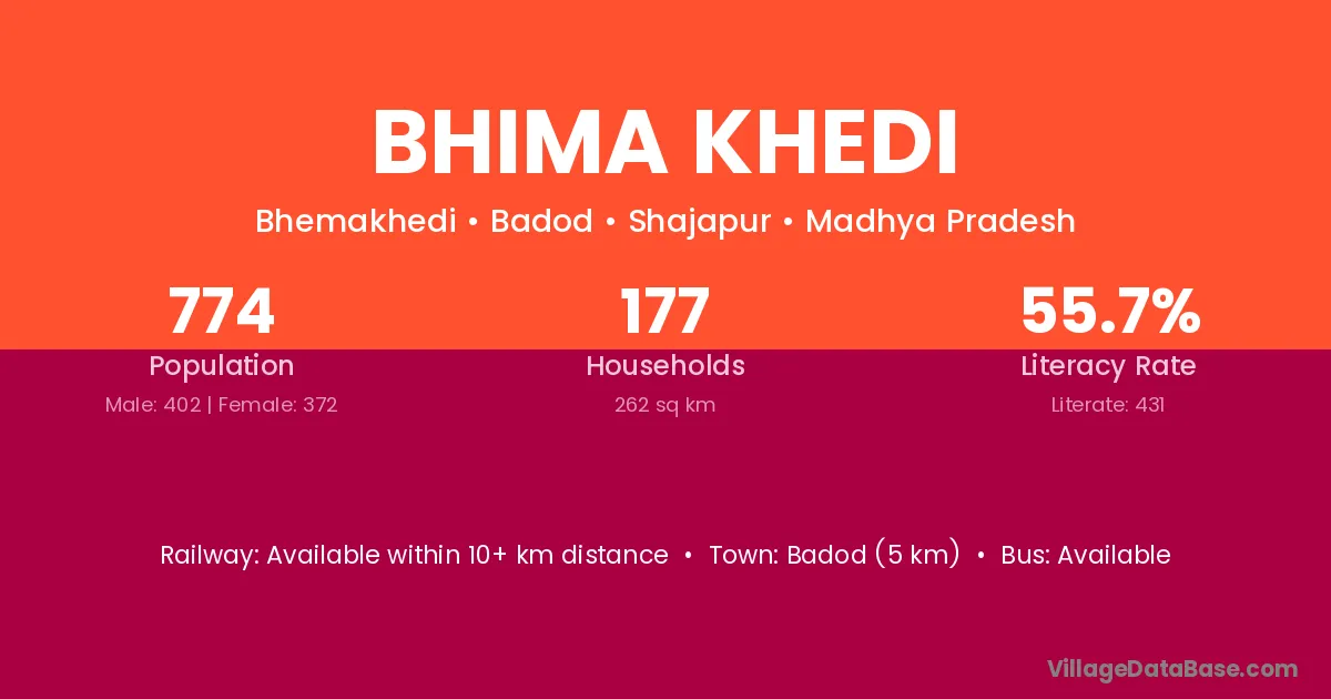 Badod (5 km) is the nearest town to Bhima Khedi village for major economic activities and is located approximately 5 km away.