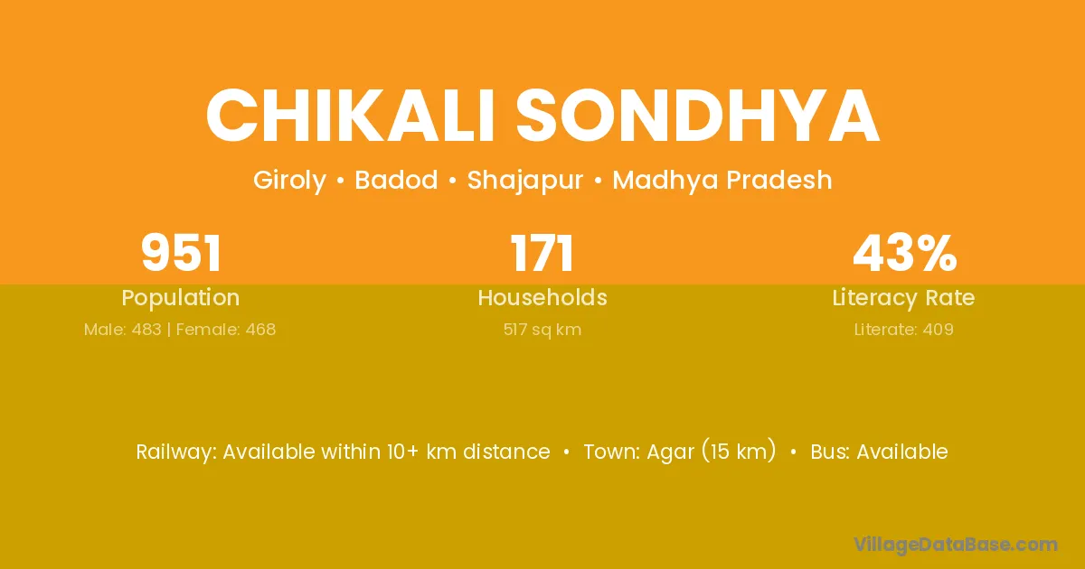 Agar (15 km) is the nearest town to Chikali Sondhya village for major economic activities and is located approximately 15 km away.