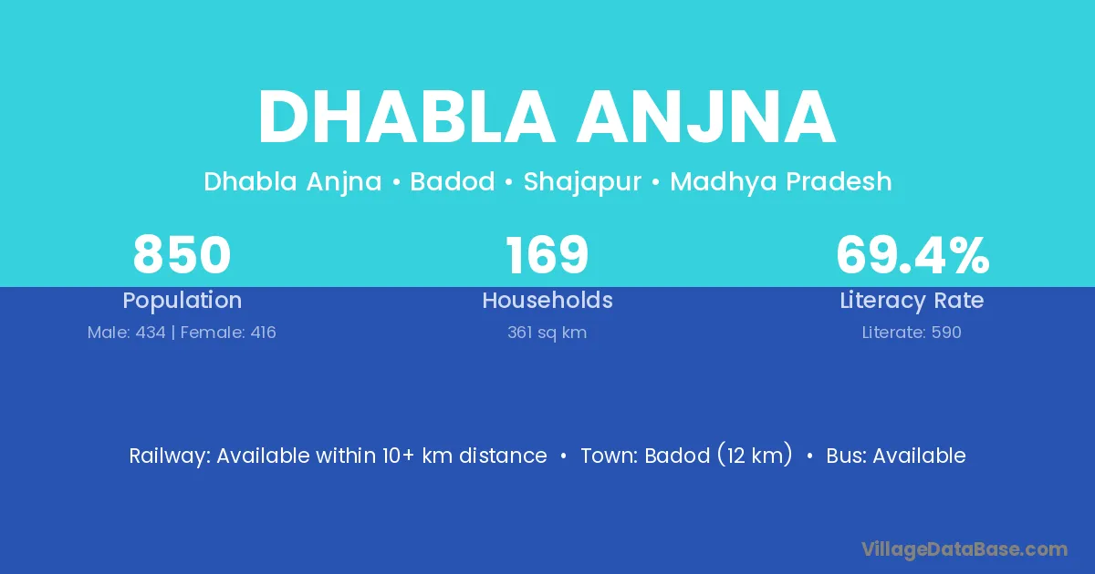 Badod (12 km) is the nearest town to Dhabla Anjna village for major economic activities and is located approximately 12 km away.