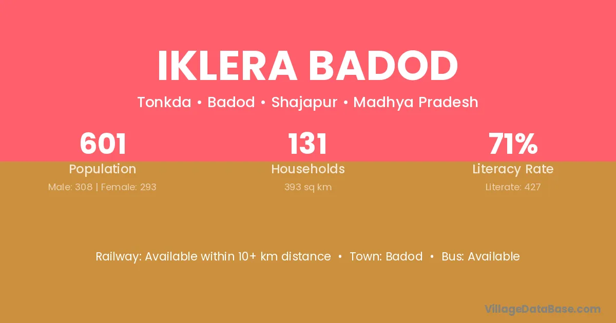 Iklera Badod village has a total population of 601 people, of which 308 are males and 293 are females.