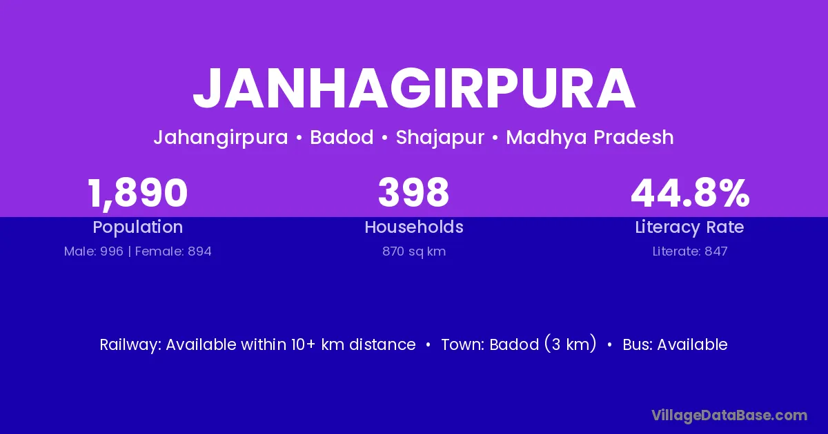 Badod (3 km) is the nearest town to Janhagirpura village for major economic activities and is located approximately 3 km away.