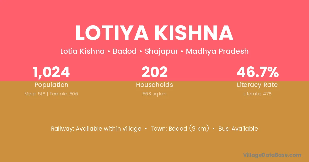 Badod (9 km) is the nearest town to Lotiya Kishna village for major economic activities and is located approximately 9 km away.