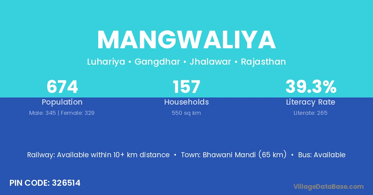 The literacy rate of Mangwaliya village is 50.06%. Male literacy stands at 65.46% and female literacy at 34.32%.