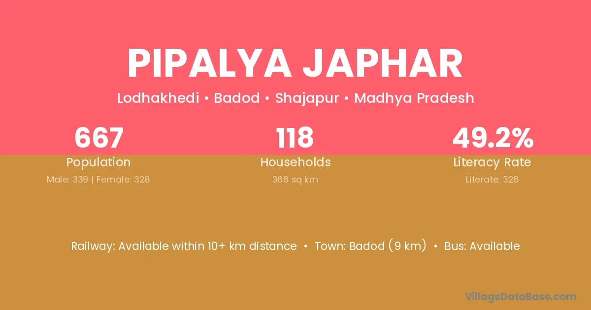 Pipalya Japhar village has a total population of 667 people, of which 339 are males and 328 are females.