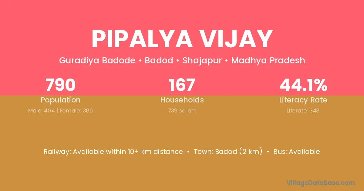 Badod (2 km) is the nearest town to Pipalya Vijay village for major economic activities and is located approximately 2 km away.