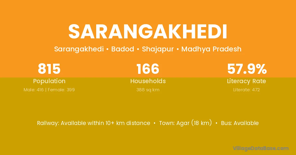 Agar (18 km) is the nearest town to Sarangakhedi village for major economic activities and is located approximately 18 km away.