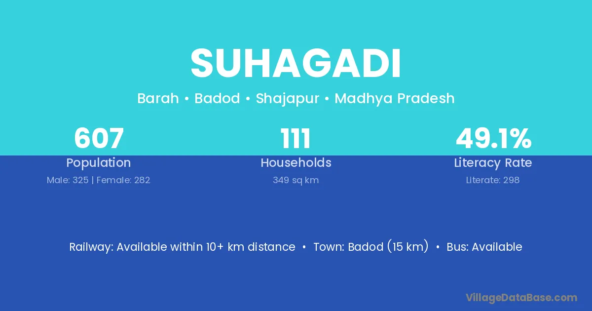 Badod (15 km) is the nearest town to Suhagadi village for major economic activities and is located approximately 15 km away.