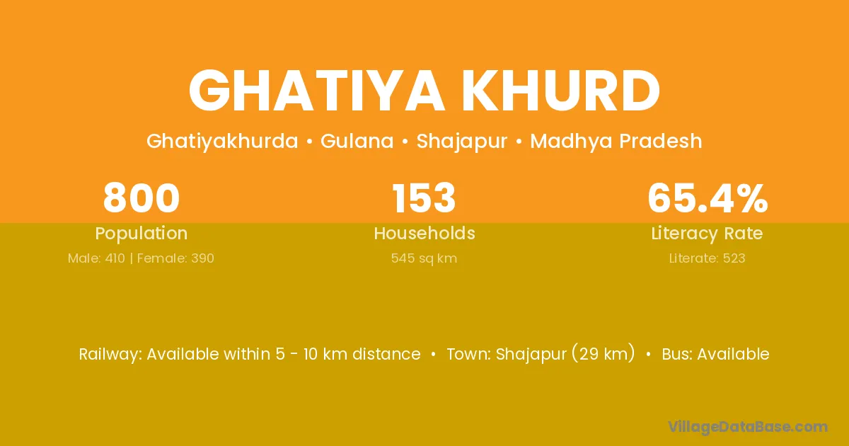 Ghatiya Khurd village has a total population of 800 people, of which 410 are males and 390 are females.