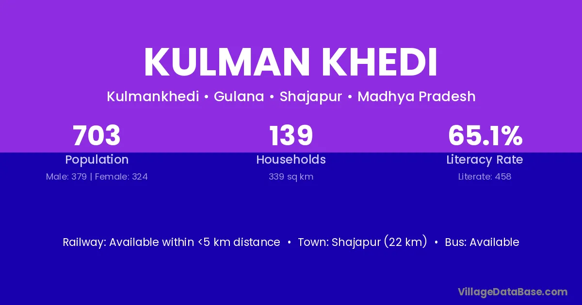 Kulman Khedi village has a total population of 703 people, of which 379 are males and 324 are females.