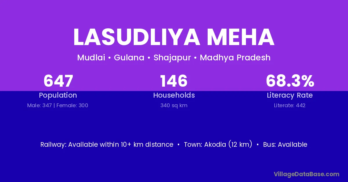 Lasudliya Meha village has a total population of 647 people, of which 347 are males and 300 are females.