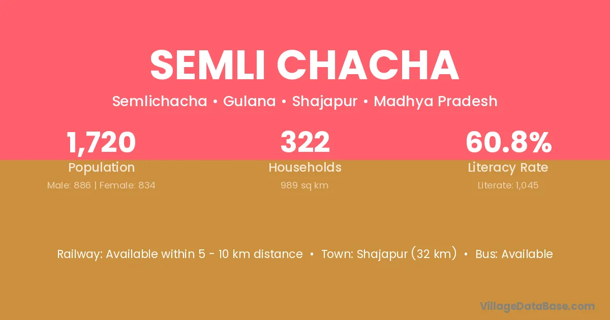 Shajapur (32 km) is the nearest town to Semli Chacha village for major economic activities and is located approximately 32 km away.