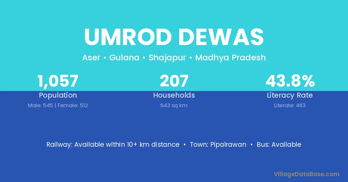 Umrod Dewas village has a total population of 1,057 people, of which 545 are males and 512 are females.