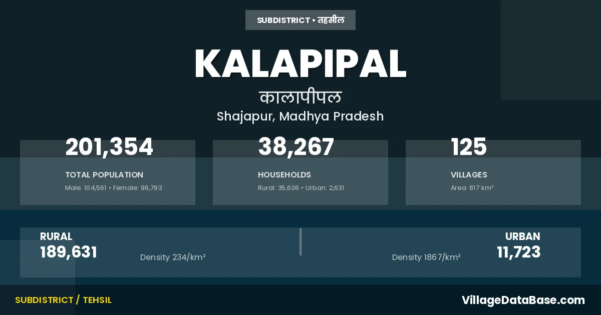 According to the 2011 census The total area of Kalapipal Tehsil is 817 km², with a population of 201354 people. The population density is 246 inhabitants per square kilometre, and there are approximately 38267 houses in the sub district.