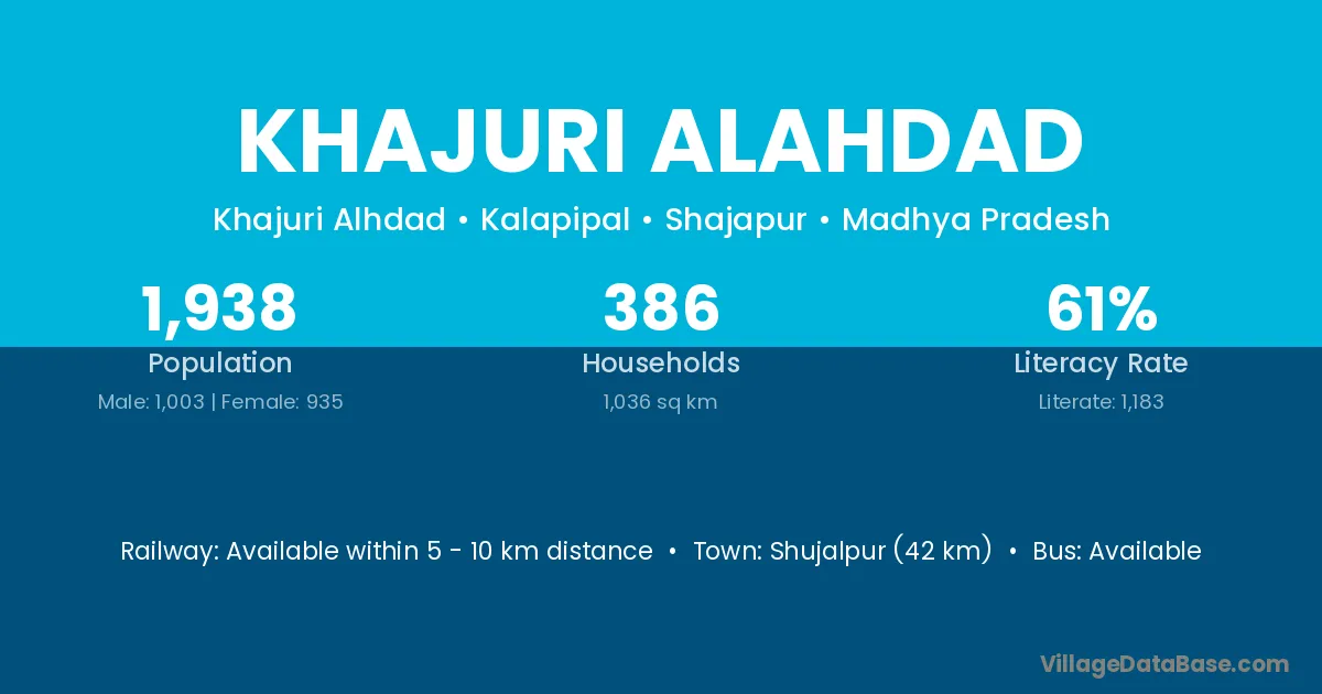 Shujalpur (42 km) is the nearest town to Khajuri Alahdad village for major economic activities and is located approximately 42 km away.
