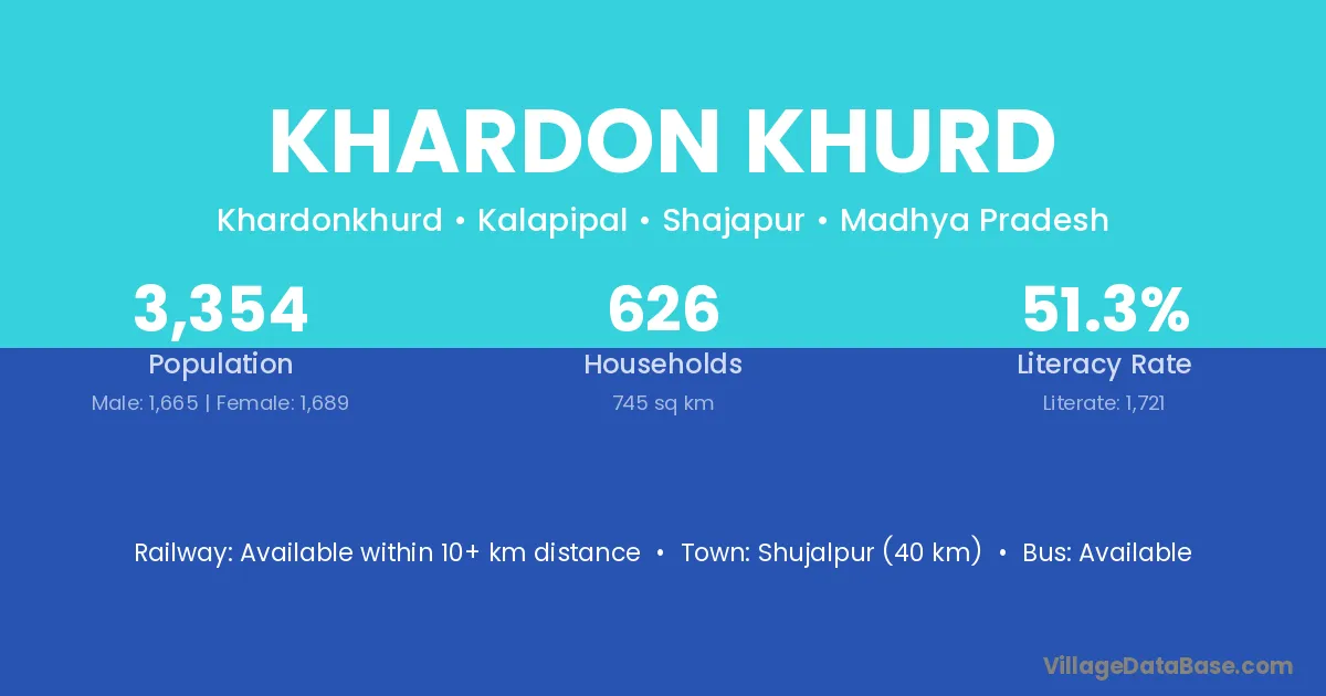 Shujalpur (40 km) is the nearest town to Khardon Khurd village for major economic activities and is located approximately 40 km away.