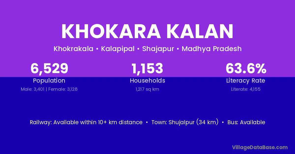Shujalpur (34 km) is the nearest town to Khokara Kalan village for major economic activities and is located approximately 34 km away.