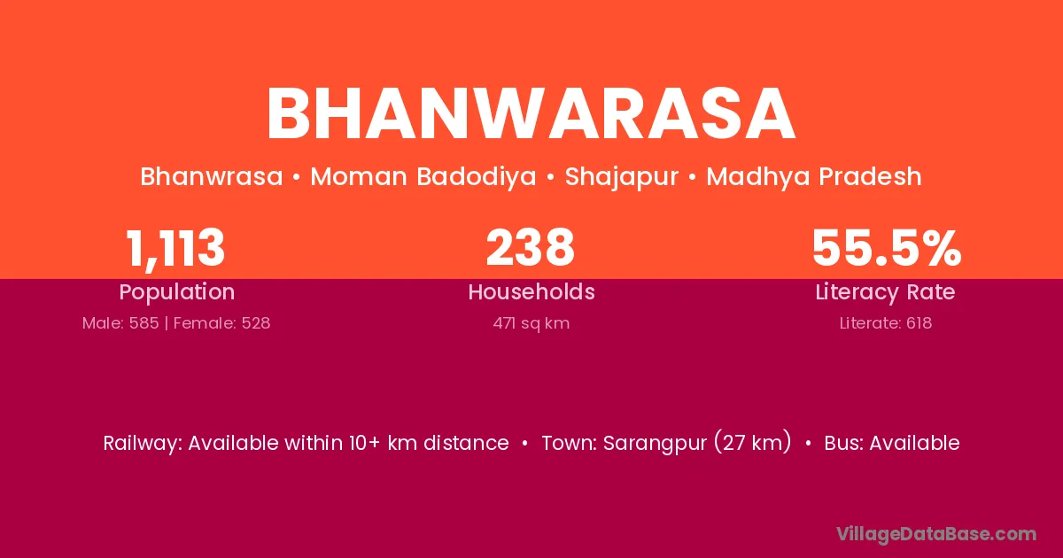 Bhanwarasa village has a total population of 1,113 people, of which 585 are males and 528 are females.